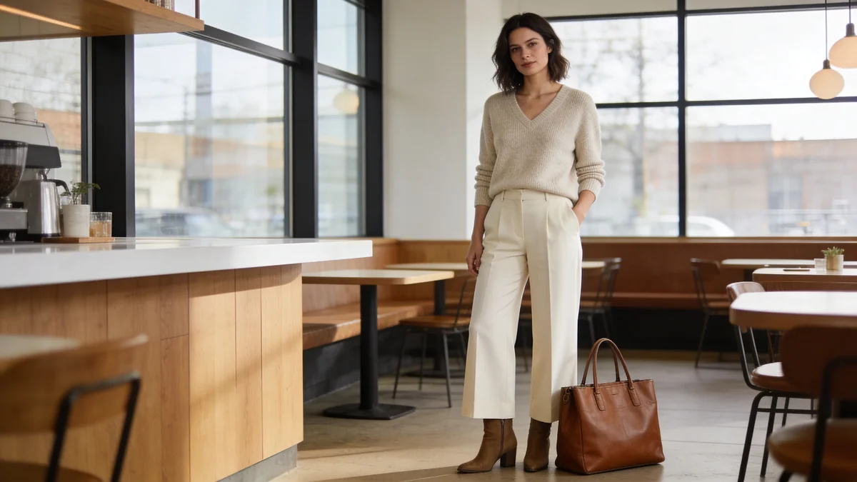 The Knit-and-Trouser Classic: Tailored wide-leg trousers in navy or cream + cashmere or merino V-neck sweater + ankle boots + structured crossbody bag + simple watch. This formula leans slightly more polished and works especially well for smart casual workplaces and lunch meetings.