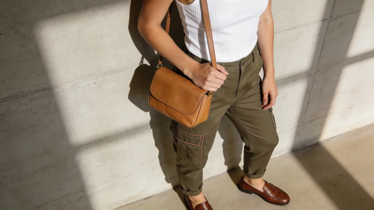 Pieces: Navy slim cargo pants + white button-down (tucked) + tan unstructured blazer + leather loafers + leather tote Works for: Smart casual workplaces, client meetings, creative offices Why it works: The blazer and button-down override the casualness of the cargo pockets. Navy reads as professional. The tan blazer adds warmth without clashing.